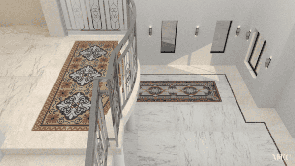 If you want the aesthetic appeal and details of a rug minus all the hassle of vacuuming and fear of spills, ornamental marble mosaic floor tiles are perfect. Marble mosaic can be easily be used with other flooring finishes and tiles. We prepared this 3D interior design render for a Middle Eastern residence. Samples, moodboards and renders are some complimentary services we offer to make the ordering process smoother.