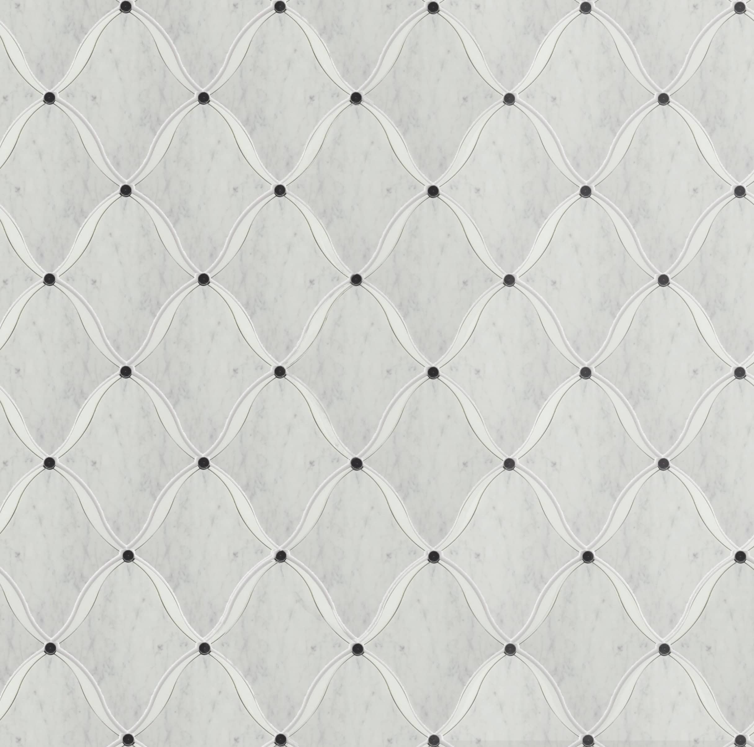 Contrasting Accents: Jet-black marble inlays highlight each intersection, offering a touch of drama against the white backdrop.