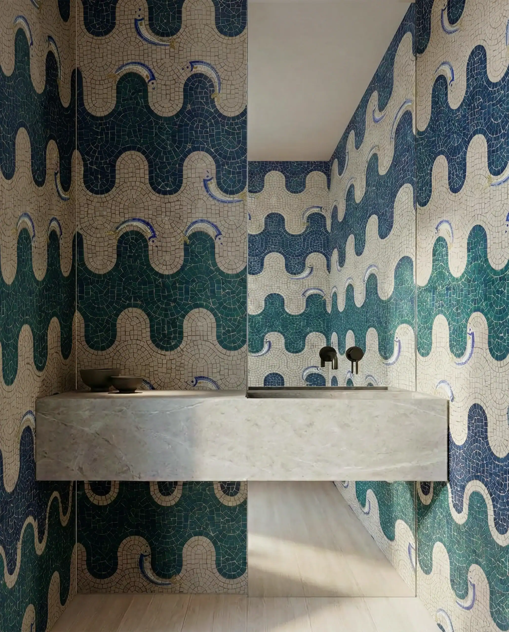 This striking mosaic installation transforms the bathroom into a rhythmic coastal sanctuary. Bold, scalloped wave forms in deep emerald, teal, and ivory create a repeating pattern that wraps seamlessly across the walls. The curved tesserae layout enhances the organic flow of the design, turning the space into a dramatic architectural statement inspired by ocean tides and movement.