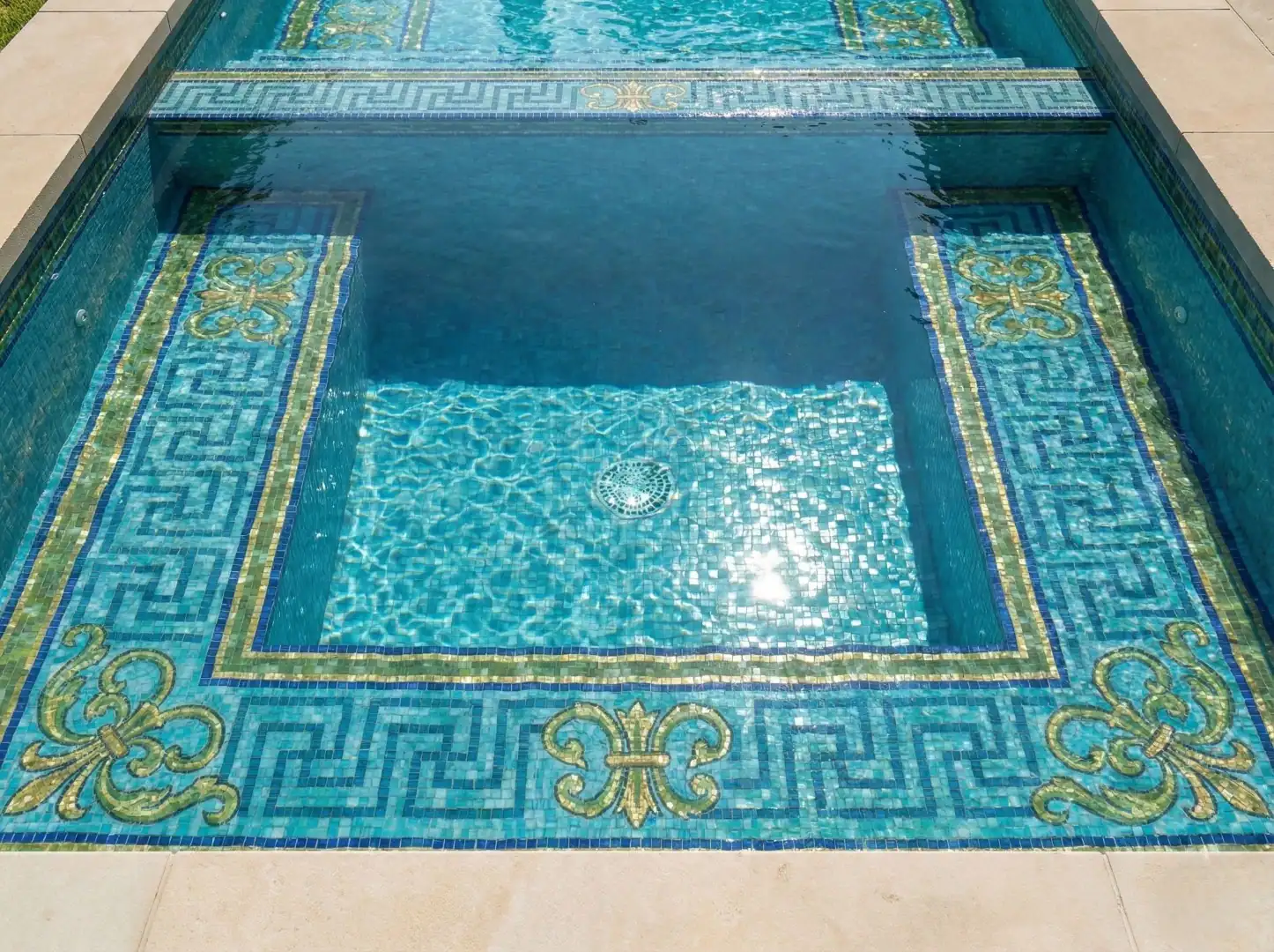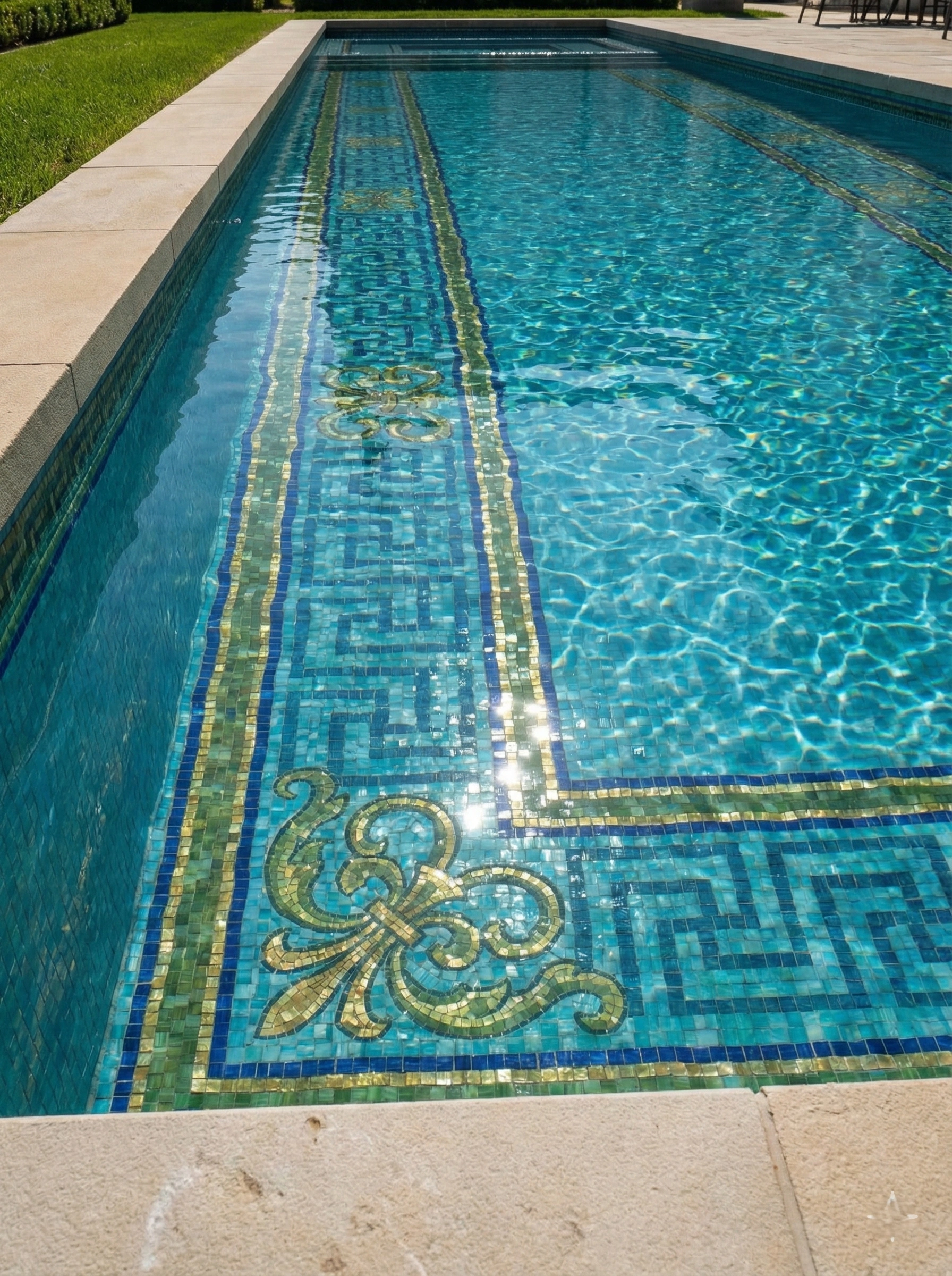 This pool mosaic uses a classic border pattern to create a clean luxury finish. The Greek key design adds structure while the gold accents keep it refined. It suits pools that want elegance without heavy artwork.