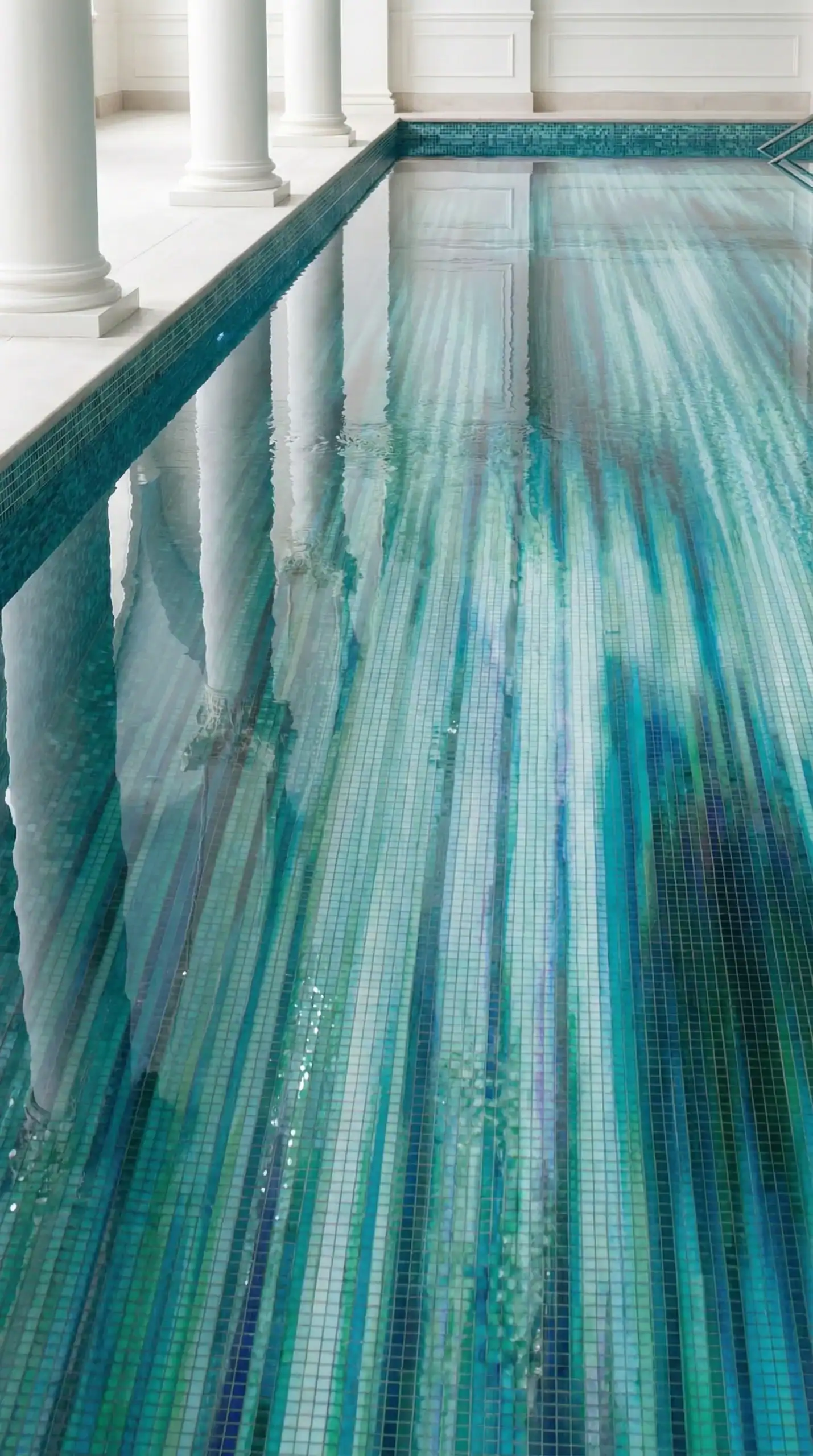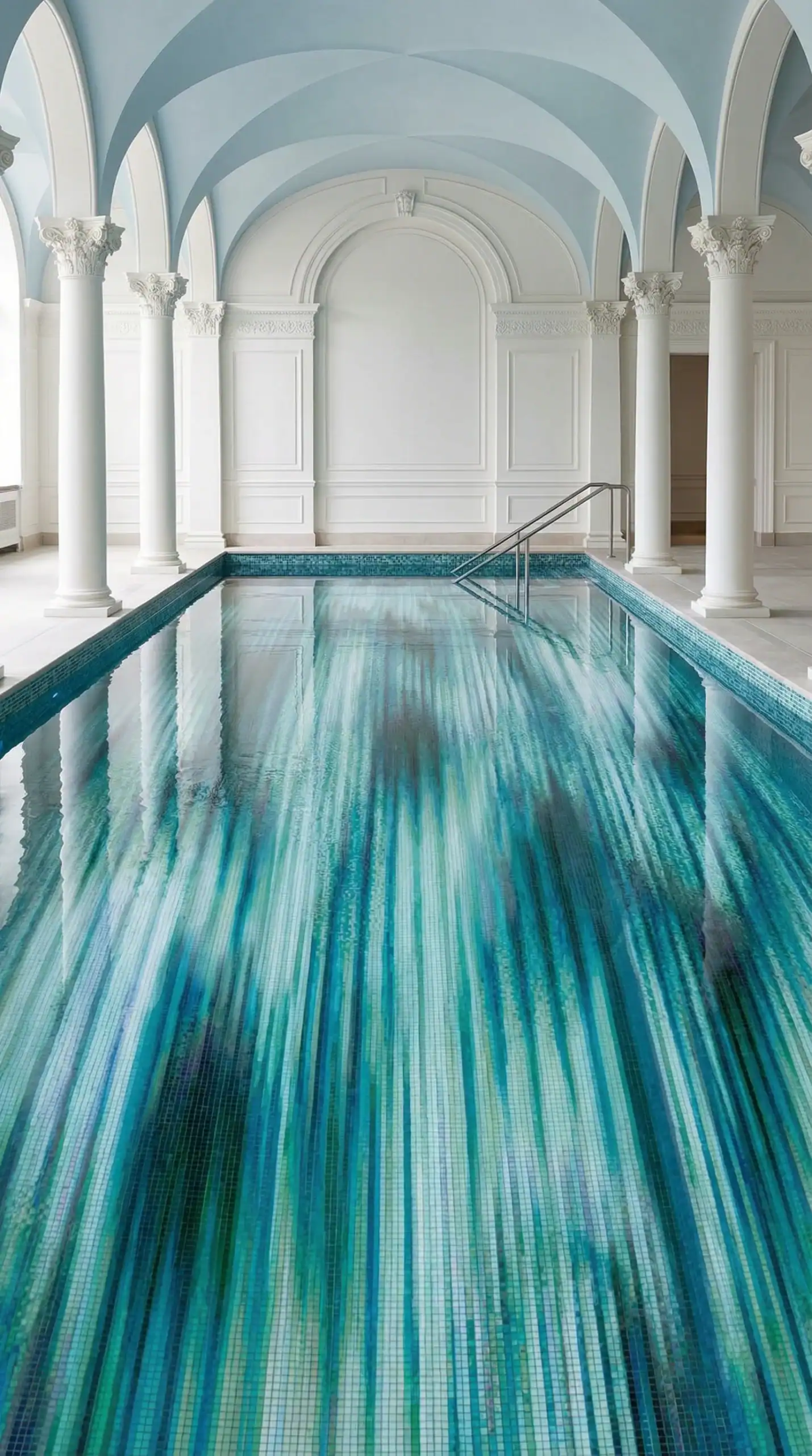 This sophisticated mosaic installation transforms the indoor pool into a serene architectural masterpiece. Featuring a striking linear ombre design, the mosaic creates a sense of depth and motion across the water surface. The blend of teal, aqua, and deep blue tones enhances the reflective quality of the pool, delivering a luxurious spa-like ambiance.