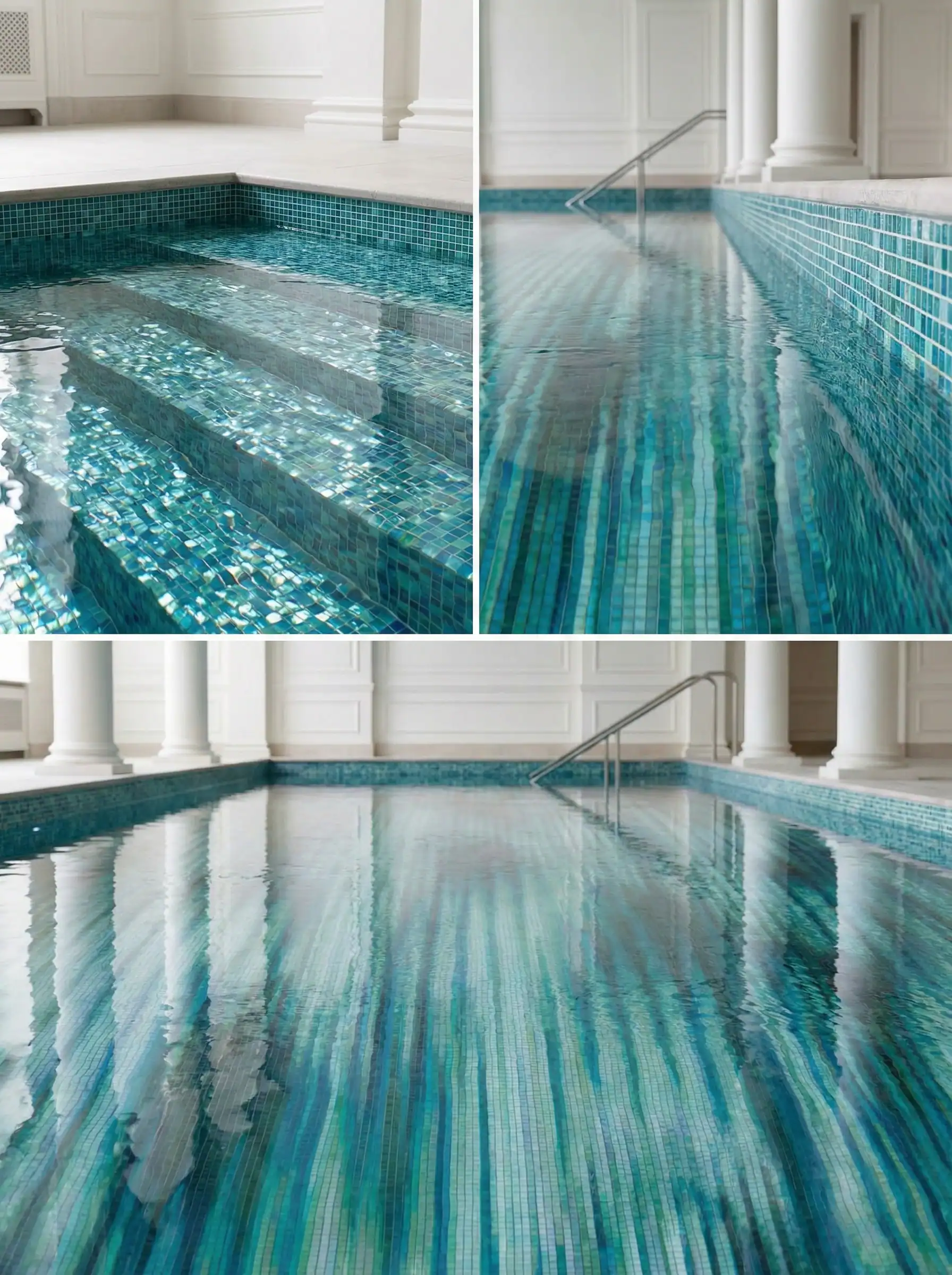 Crafted from premium glass mosaic, this surface is chlorine-resistant, UV-stable, stain-resistant, and highly durable. It is designed for long-term performance in indoor pools while maintaining vibrant color clarity.