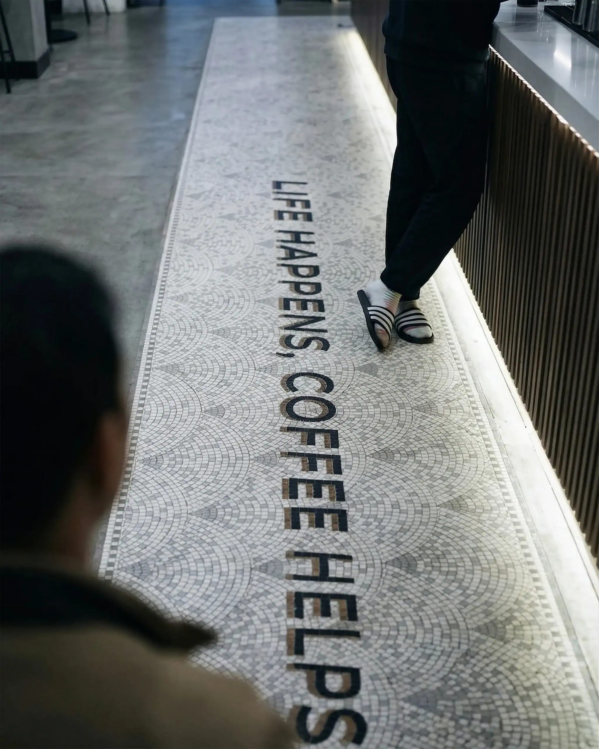 Modern mosaic with bold coffee-inspired message. Clean typography meets subtle geometric texture. Perfect for cafés and contemporary interiors.