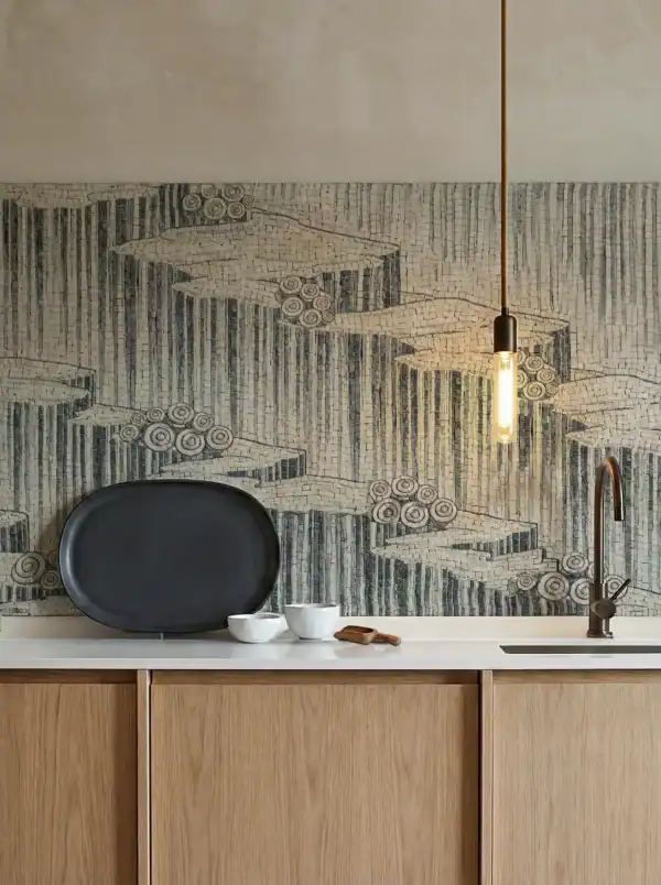 Inspired by natural flow and organic geometry, this mosaic introduces a calm yet artistic element into interiors. It pairs seamlessly with wood cabinetry and modern fixtures, enhancing contemporary spaces.