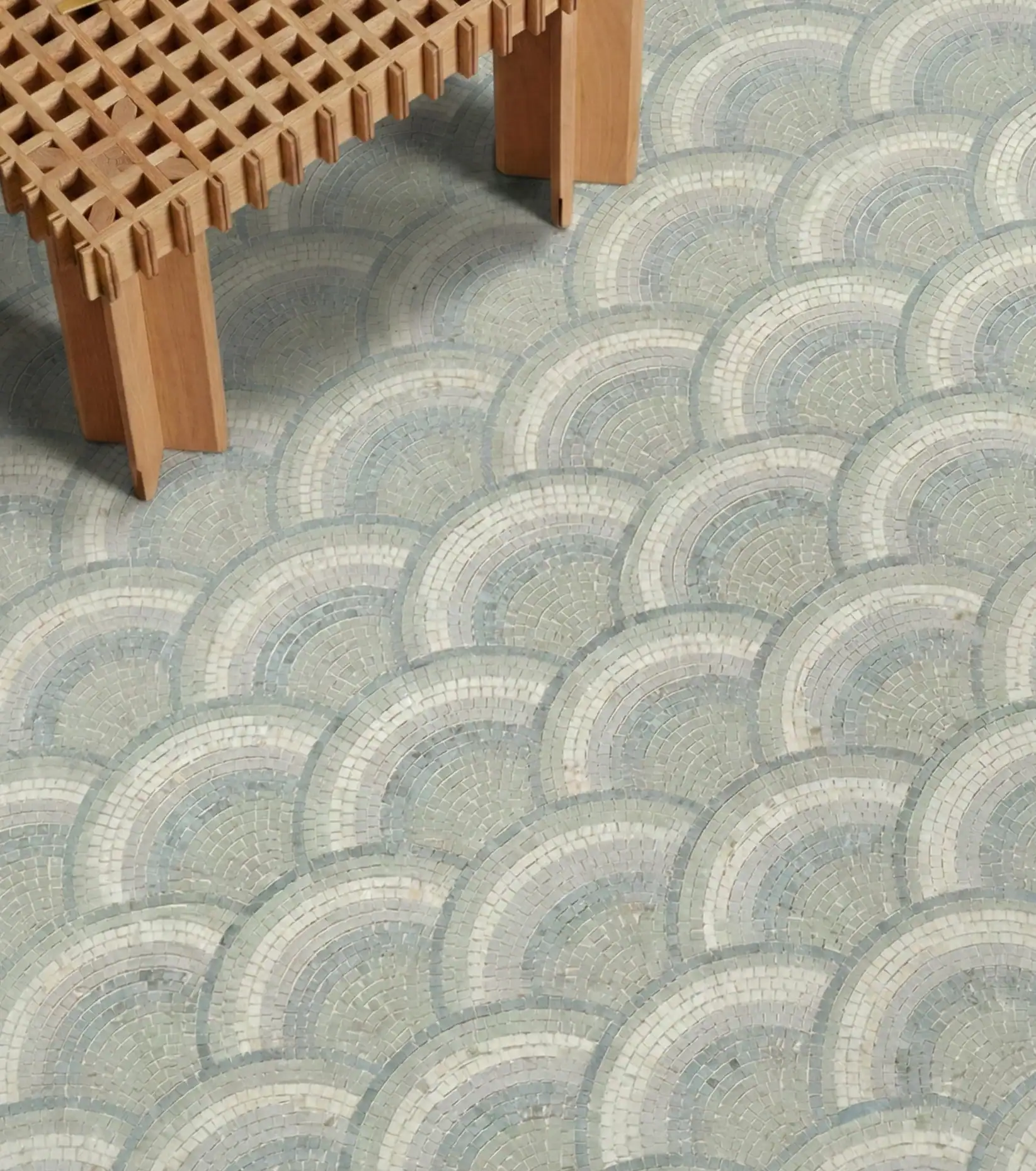 This elegant mosaic floor design brings a sense of calm and fluidity into interior spaces. “Morning Mist Arcs” features softly layered arc patterns in gentle blue and ivory tones, creating a serene, wave-like rhythm across the surface. The design evokes a tranquil atmosphere while maintaining a refined architectural presence.