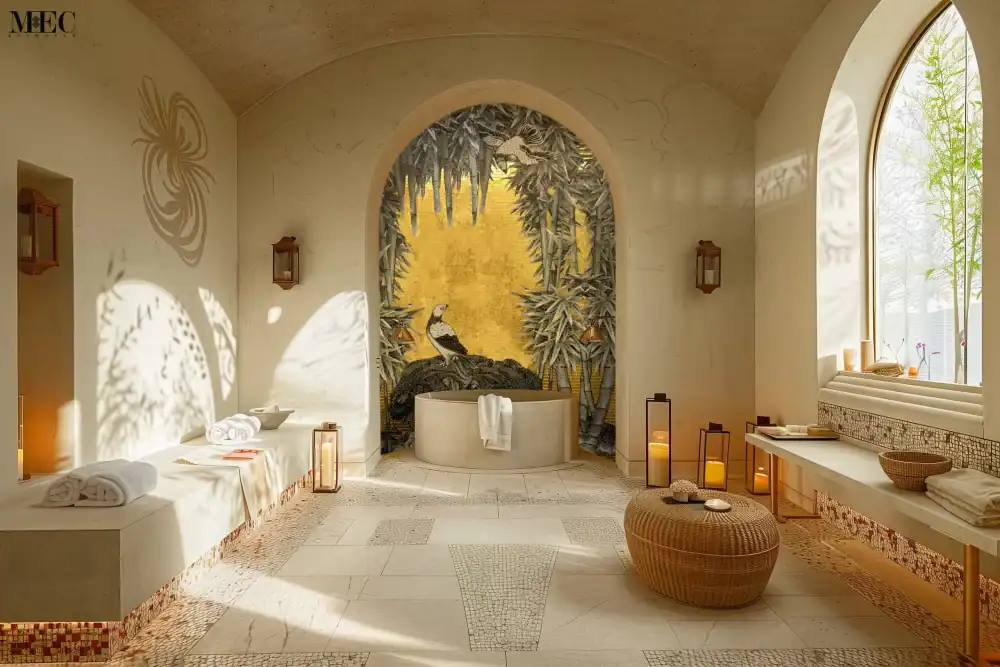 This custom mosaic mural transforms an interior into a serene sanctuary, combining the elegance of tropical birds, cascading bamboo, and a glowing golden backdrop. Installed as the centerpiece of a spa-inspired space, it radiates warmth, balance, and artistry, making the wall itself a statement of design.