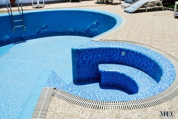 The Ocean Tide Glass Mosaic Tile not only adds aesthetic appeal but also enhances the functionality of the pool. The built-in tiled seating area offers a stylish resting space, while the overall design gives the pool a resort-like luxury feel. The shimmering glass tiles reflect sunlight beautifully, making the water sparkle like the sea.
