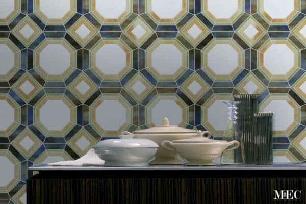 Classic mediterranean octagon and square waterjet glass tile pattern made with MECs exclusive Jade Glass medium.