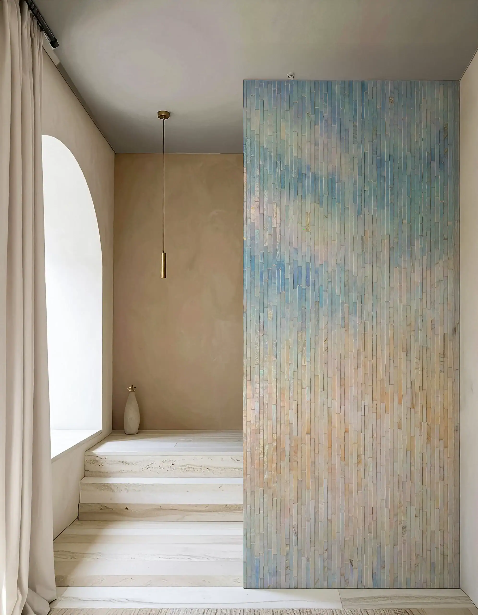 This Opal Sky Gradient Mosaic feature wall shows a clean ombre fade using slim vertical “stick” mosaic tiles. The color starts in warm sand and soft peach near the bottom and moves upward into cool misty blue tones, like a calm sky meeting light stone. The long, narrow pieces create a tall, elegant look, while small shade changes inside each tile keep the gradient smooth and natural. The finish looks slightly pearly, so the surface catches light and adds gentle depth without feeling shiny or loud.
