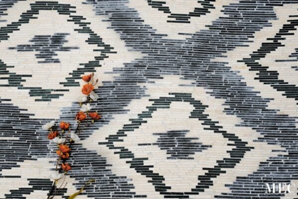 The mosaic replicates the look of woven threads, with the black tiles forming a series of diamond-like and blurred chevron patterns. The pixelated aesthetic of the individual stone slivers gives the mosaic an artisanal, handcrafted look while offering high precision and consistency. Every segment has been carefully placed to mimic the dye-and-weave appearance of handloom fabrics, showcasing exceptional craftsmanship.