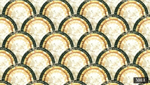 What distinguishes the Oristano design is its rich color gradient. Each fan-shaped arch is composed of multiple bands that radiate outward, transitioning from creamy ivory and beige in the center to warm gold and ochre tones, and finishing with a dramatic outer border in deep forest green. This layered coloration forms a gradient that mimics the natural shimmer of seashells or sunrays, offering a vibrant yet earthy color scheme that brings both warmth and depth to any space.