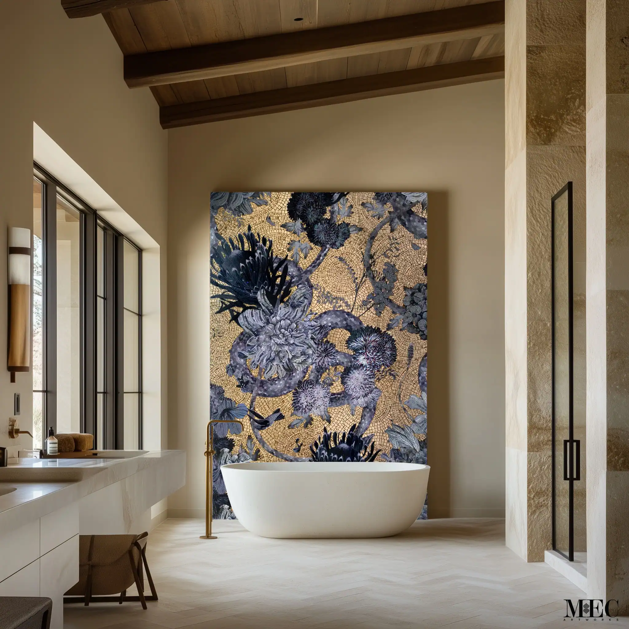This bespoke floral mosaic artwork turns an ordinary wall into a breathtaking canvas of artistry and elegance. Designed with meticulous attention to detail, the mural combines natural botanical motifs with a shimmering golden background, creating a dramatic contrast that elevates the entire space.