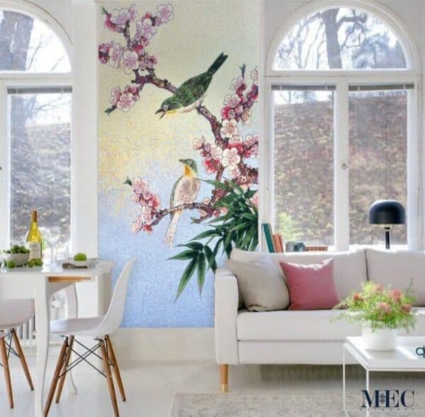 Glass mosaic arranged tile by tile manually to create a majestic scenery of two birds on a blossoming tree and an enchanted faded morning sky backdrop.