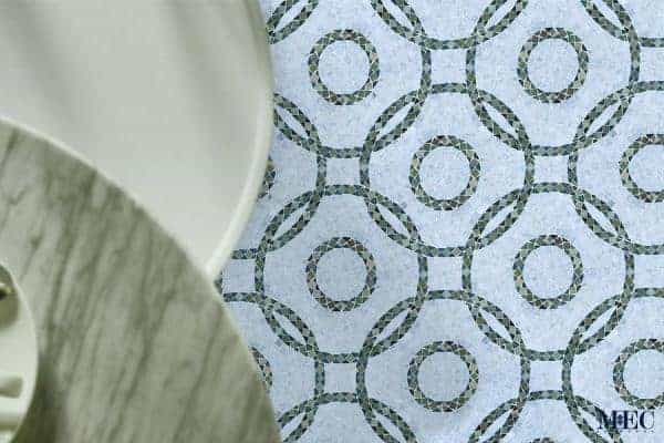 The dominant background of the mosaic is crafted from soft white marble, which provides a calm, luminous surface that enhances spatial brightness. Within this pale field, the circular motifs are outlined in rich green and deep brown tesserae, forming a subtle but striking contrast. The green tones—reminiscent of emerald and jade—bring a natural freshness to the pattern, while the earthy browns ground the design with a sense of warmth and depth. These contrasting hues are arranged in a precisely balanced palette, making the entire mosaic visually cohesive and timeless.