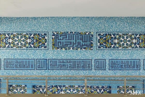 Intricate floral Arabesque pattern complimented elegantly with Kufic Islamic Calligraphy and blue glass mosaic random mix tiles. The complete Mosque wall is cladded with rich Persian floral motifs and Calligraphy work using glass mosaic handcrafted tiles produced by MEC artisans.