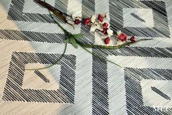 High Contrast: The design employs a high contrast between the dark lines and the lighter background marble. This contrast enhances the visibility of the linear patterns within each block and the overall geometric structure of the mosaic.