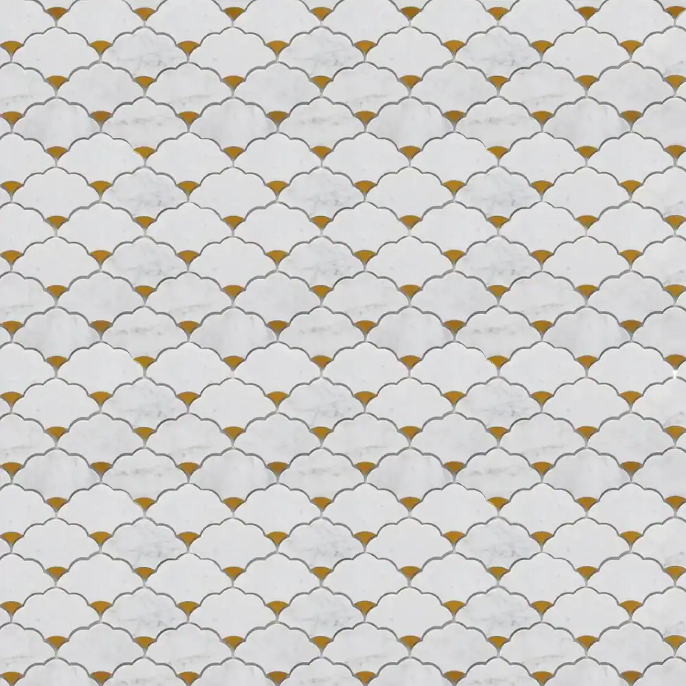 The Radiant Drops Marble Mosaic transforms ordinary interiors into sanctuaries of refined elegance. With its overlapping fan-shaped tesserae carved in pristine white marble with golden accents, this piece evokes the imagery of rolling clouds illuminated by sunlight. Both timeless and contemporary, it serves as a versatile canvas for bathrooms, kitchens, and luxury commercial spaces.