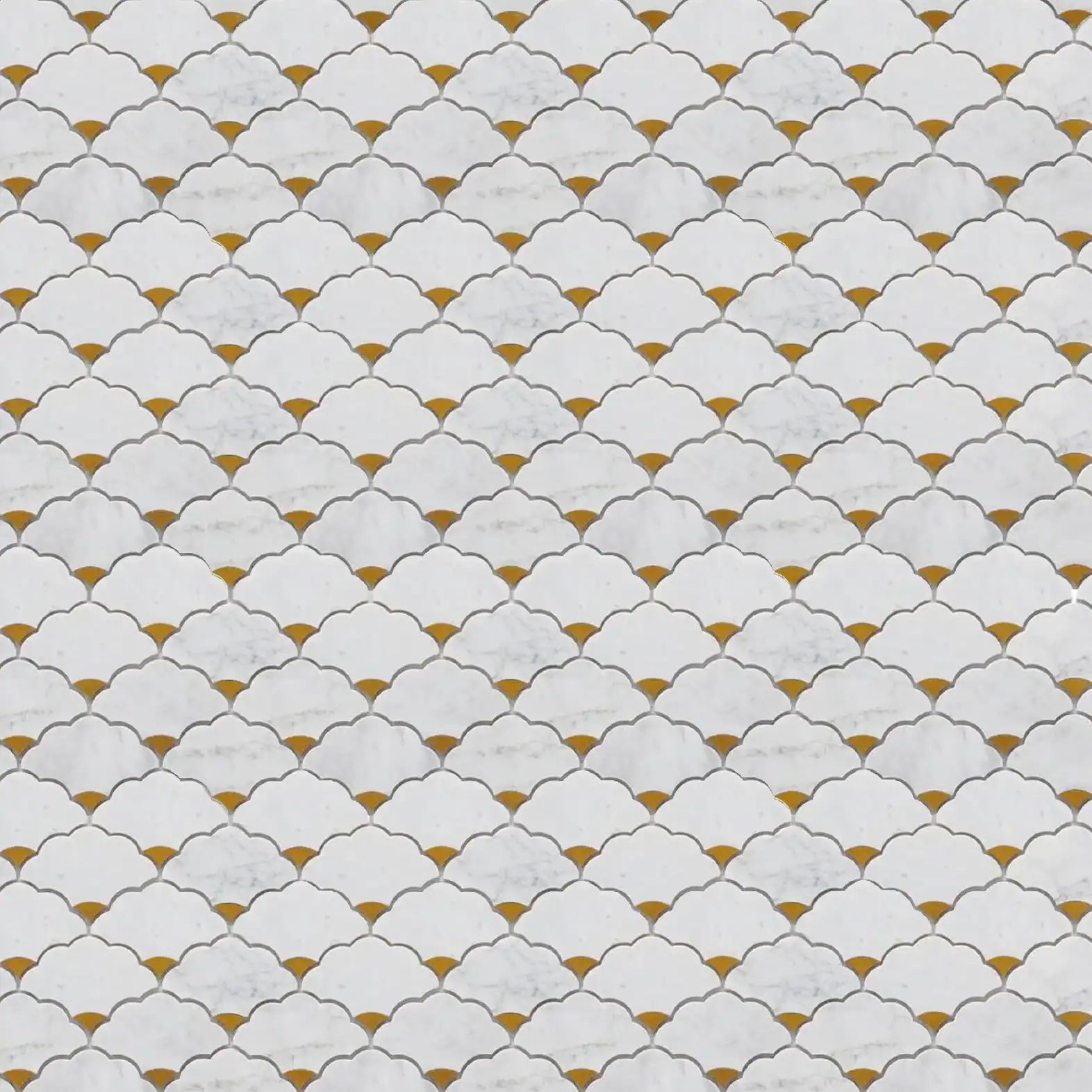 This marble mosaic pattern exudes timeless elegance with its delicate teardrop-inspired design. Crafted from soft white marble with subtle veining, each tile is outlined in a fine edge and accented with golden touches at the base, creating a sense of depth and luxury. The repeated scallop-like formation evokes the fluid rhythm of clouds or waves, making it versatile for both modern and classic interiors. Perfect for walls, backsplashes, or statement flooring, this mosaic blends natural sophistication with a hint of opulence, transforming any surface into a refined canvas of texture and light.