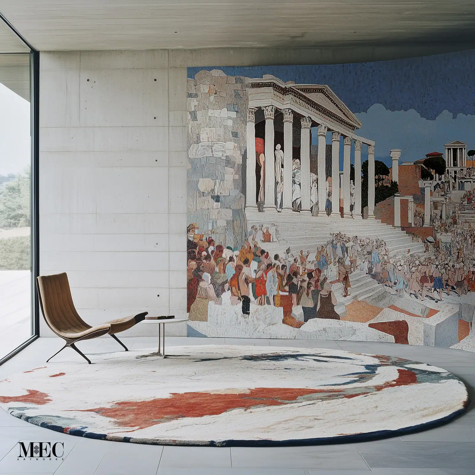 The mosaic is the clear artistic focal point of the room, positioned against a raw concrete wall. This stark, modern backdrop provides a powerful contrast that highlights the mosaic’s classical theme. The minimalist furniture and clean lines of the space create a harmonious and elegant juxtaposition.