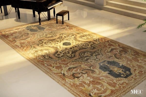 Each section is meticulously crafted with fine marble tesserae, offering a highly textured surface that mimics the softness of a traditional rug while maintaining the durability of stone.