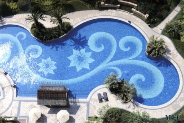 The mosaic tiles showcase a stunning range of blue tones, from deep sapphire to light aquamarine, creating a captivating contrast that shimmers under natural sunlight. The gradient effect adds depth, making the pool appear more expansive and inviting.