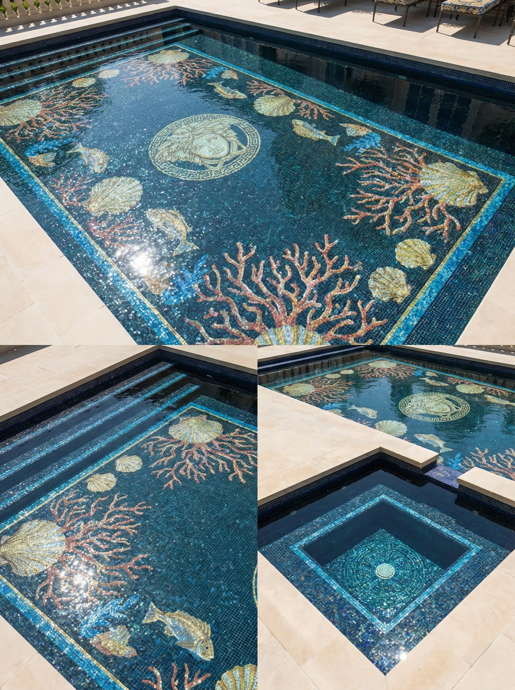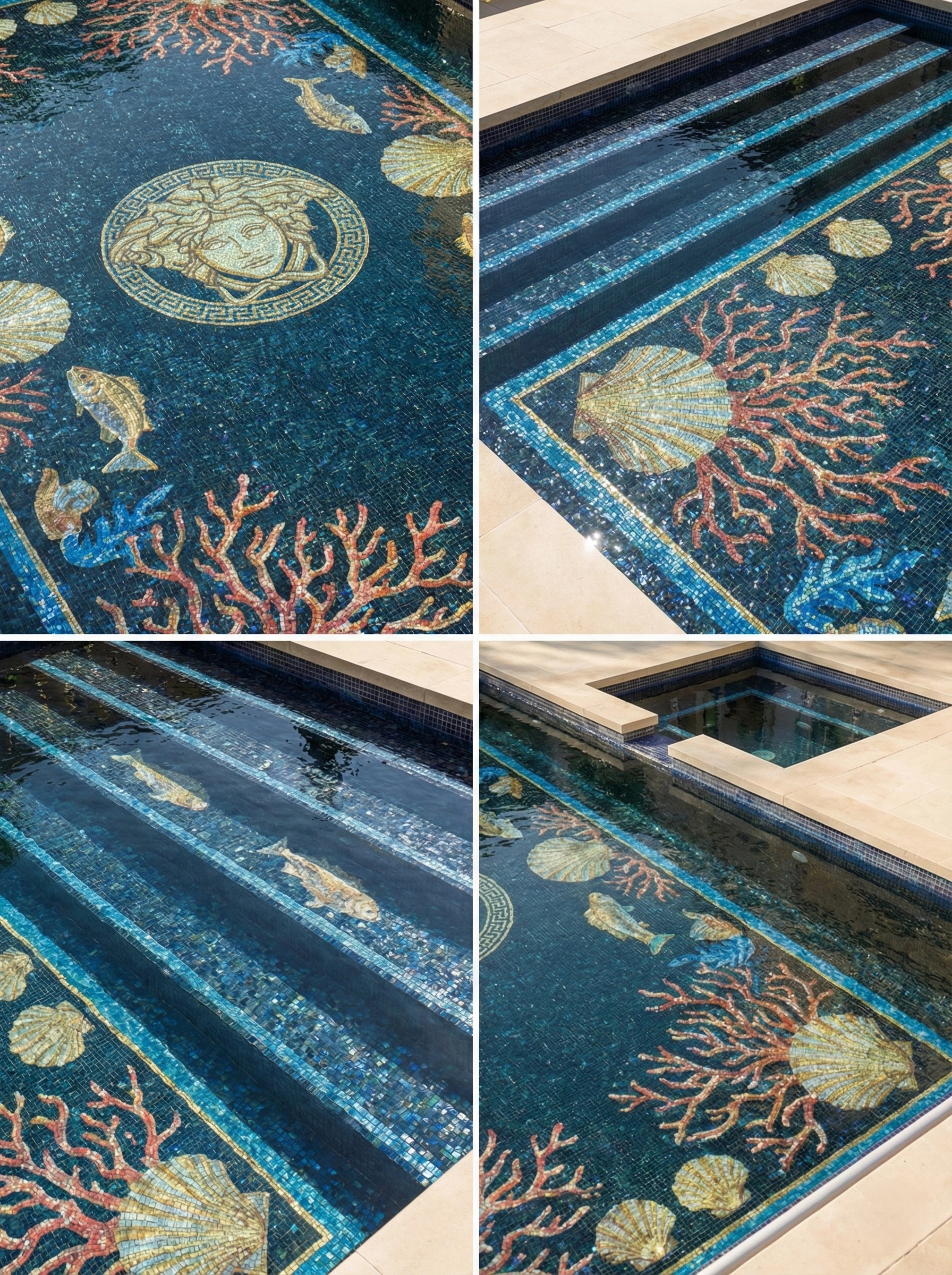 This luxury pool mosaic design features a deep navy-blue base with a detailed marine layout inspired by underwater life. The center includes a Medusa-style face medallion, surrounded by coral branches, shell motifs, and small fish illustrations arranged in a balanced frame. Warm coral-pink and golden beige accents create strong contrast against the dark blue tiles, giving the pool a bold, artistic identity that looks rich and clear under water.