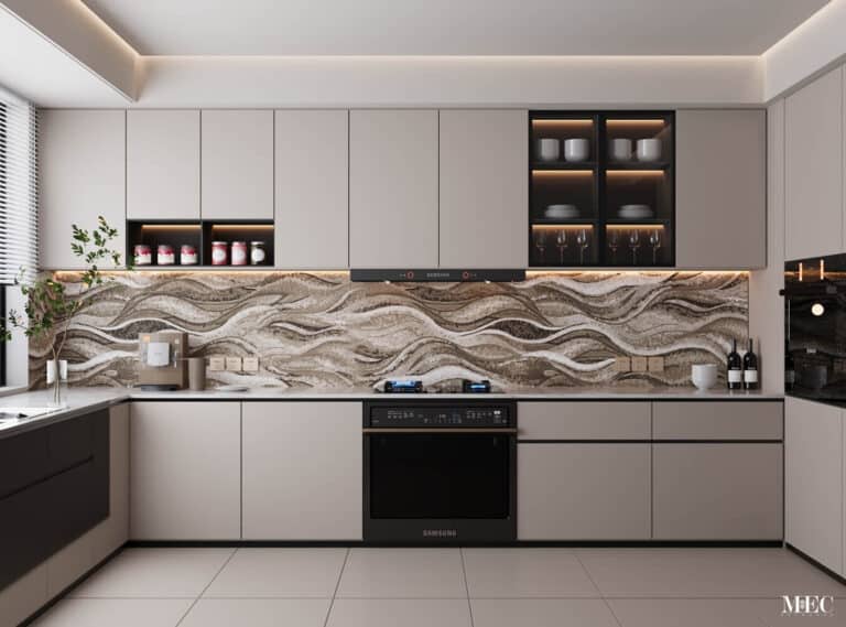 Subway tile for a kitchen backsplash is a classic, but if you’re looking for something truly unique, this abstract glass mosaic offers a stunning alternative. Why settle for ordinary when you can get a custom designed backsplash that combines artistic beauty and practical durability?
