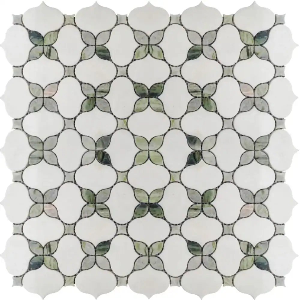 The Serene Clover Marble Mosaic brings natural harmony and timeless beauty to interior spaces. Featuring soft white marble forms outlined with delicate green marble inlays, this mosaic captures the elegance of a four-leaf clover motif. Its subtle contrast and organic geometry make it ideal for serene, spa-inspired environments and sophisticated modern homes.