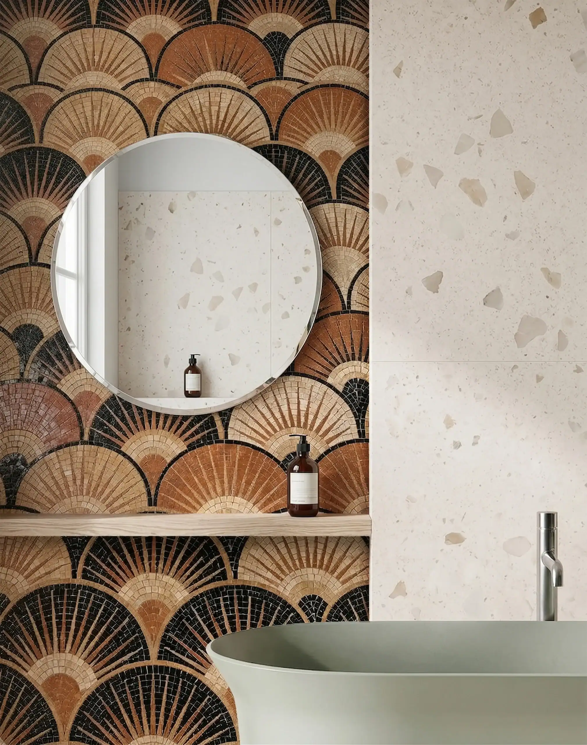 Art Deco fan mosaic with warm terracotta tones. Creates a bold and elegant statement wall. Perfect for luxury bathrooms and modern interiors