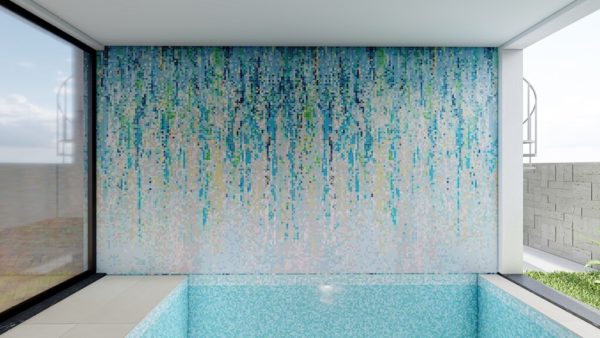 What can be done if a client likes two abstract mosaic tile designs? Well, one way is to mash them up. Our design team can extract your favorite elements from different mosaic patterns and combine them together in a new custom one. In this case a lovely homeowner from Chicago loved the hanging vine effect of Fall Sprinkle from our Elysian collection. However, she wanted a cool blue and green color palette, similar to that of Warm Glow Firefly from Our PIXL Prism catalog. Both those mosaic designs were made with the help of MEC’s exclusive AddTek system for walls. The client wanted the custom design to be created for an indoor swimming pool area wall.