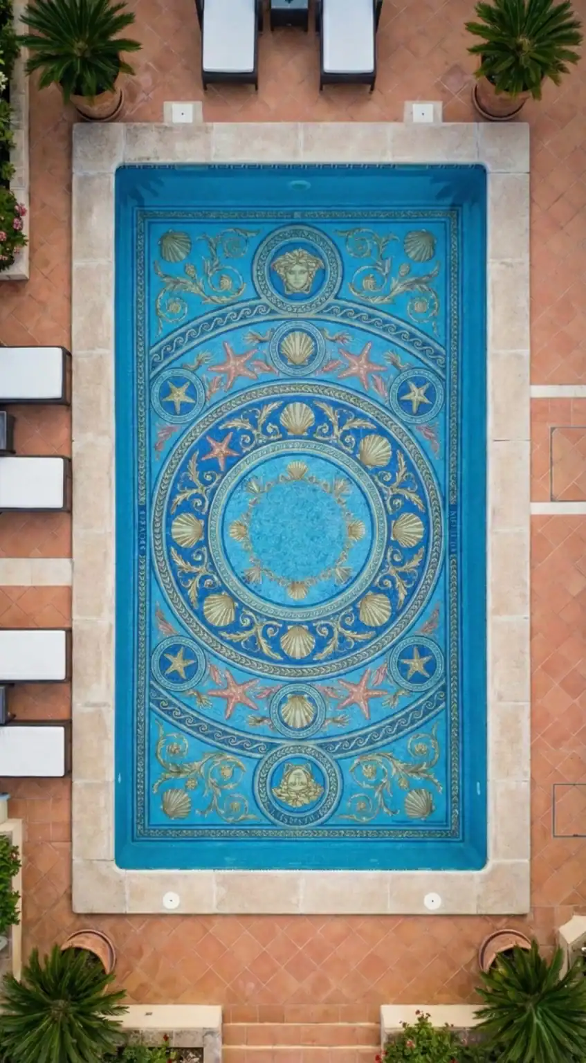 This pool mosaic brings a coastal luxury feel with shells, starfish, and bold circular detailing. The gold accents add richness while the blue base keeps it fresh and clean. It works best for pools that want a strong marine-inspired statement.