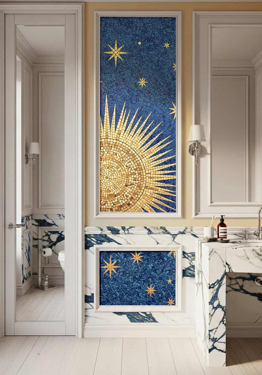 Bring celestial elegance into your bathroom with this radiant mosaic mural that celebrates the brilliance of the sun and stars. Crafted with golden tesserae that shimmer against a rich blue backdrop, the design captures the warmth of the sun’s rays as they burst outward into the cosmic sky. Accented with luminous golden stars scattered across the panel, the mural evokes a sense of grandeur and serenity, turning the space into a harmonious blend of luxury and wonder. Perfectly framed within the bathroom’s classic marble setting, this piece transforms everyday routines into moments of celestial escape.