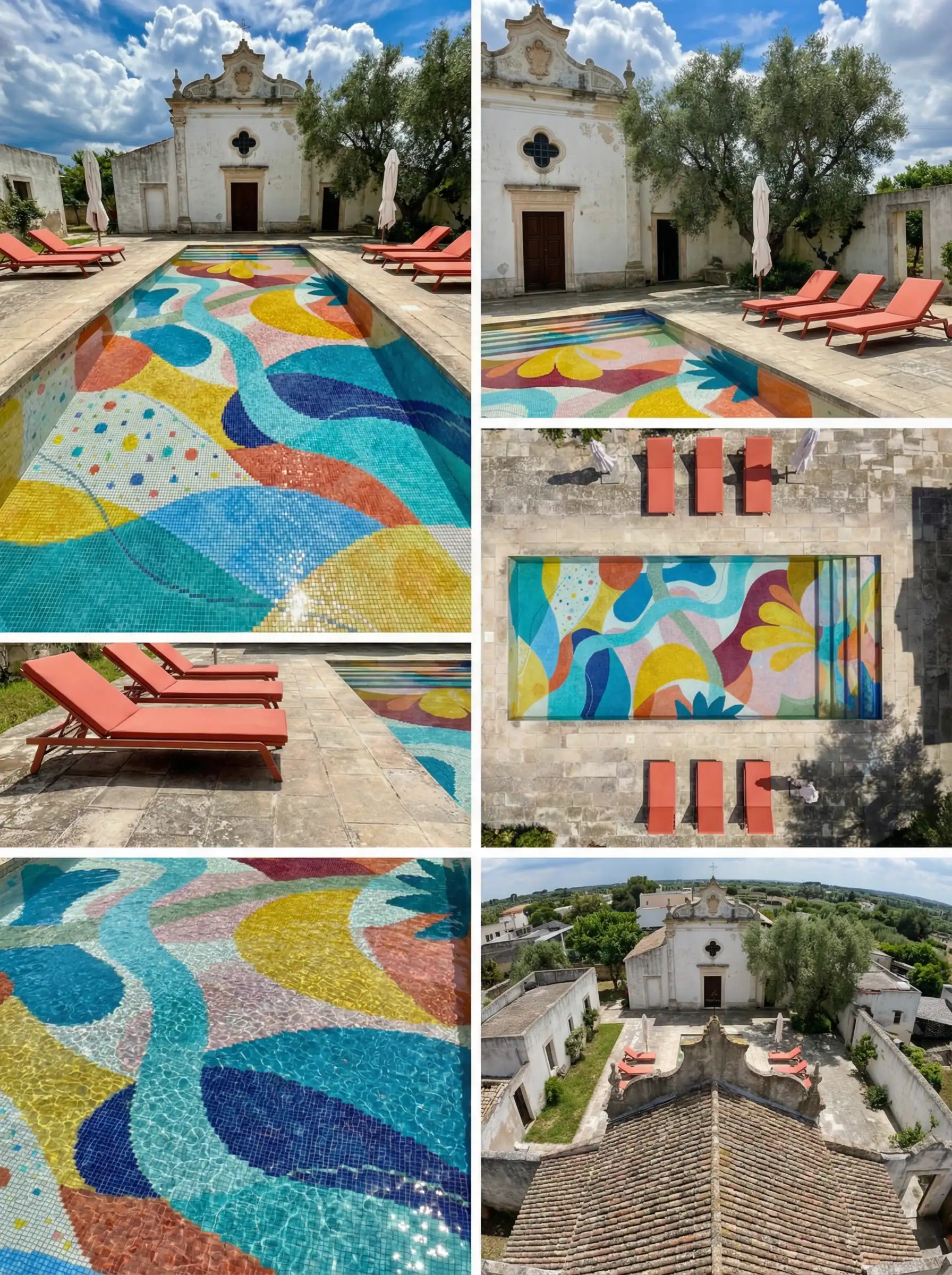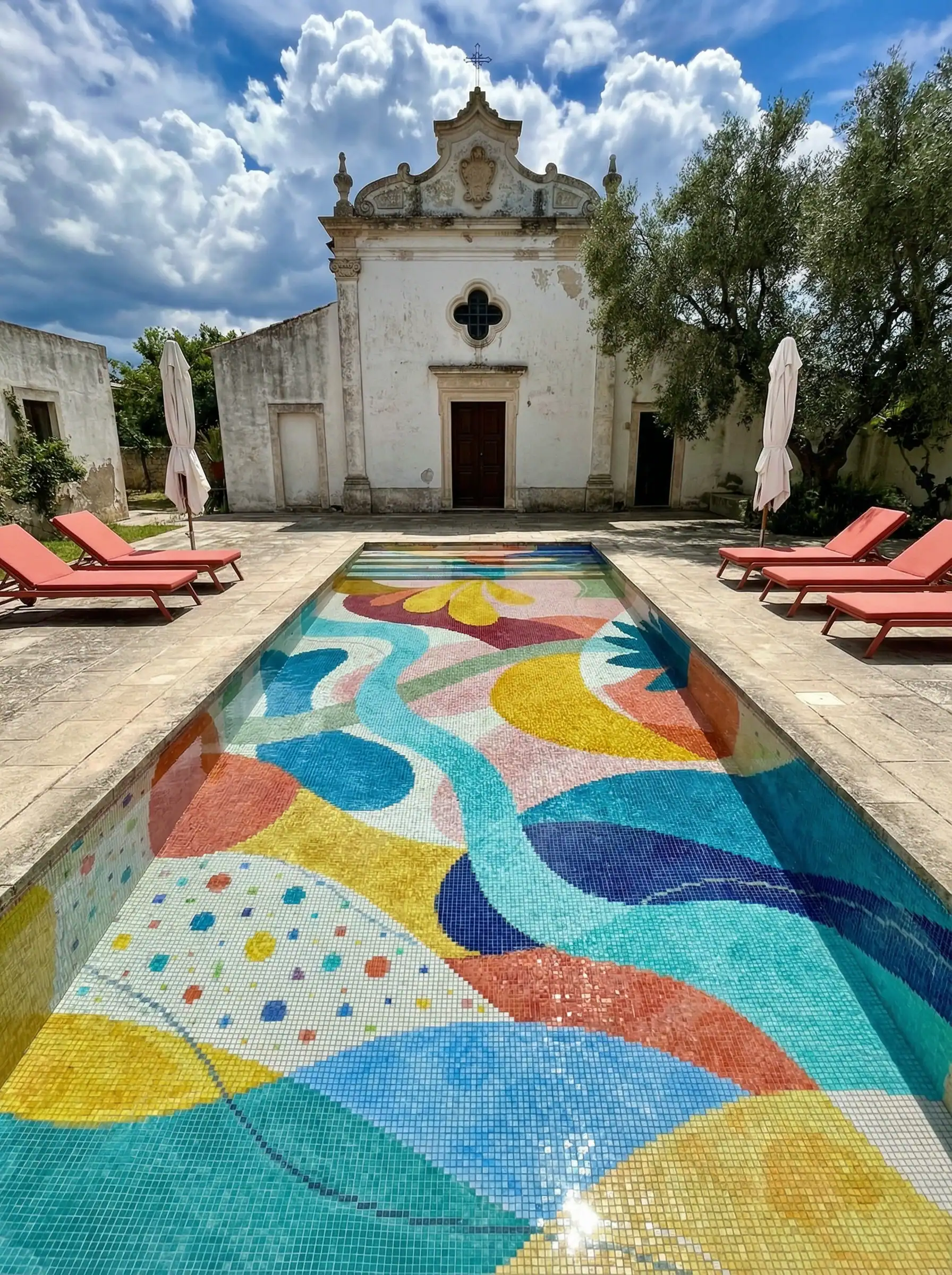 This vibrant mosaic installation transforms the pool into a bold artistic statement. Featuring a dynamic blend of abstract shapes and flowing forms, the design combines vivid colors to create a lively and contemporary visual impact. The interplay of curves, patterns, and bright hues brings energy and creativity into outdoor spaces.