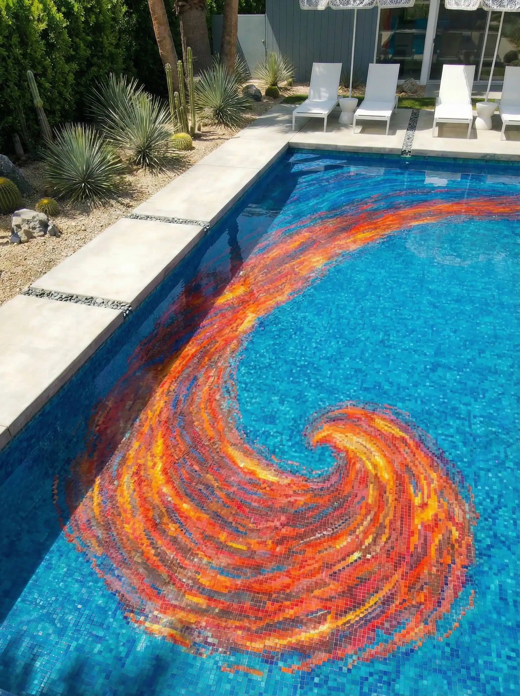 This striking mosaic installation transforms the pool into a bold artistic statement. Featuring a dynamic wave-like design in fiery red, orange, and deep blue tones, the composition evokes energy and movement across the water surface. The contrast between vibrant colors and calm blue water creates a visually captivating centerpiece.