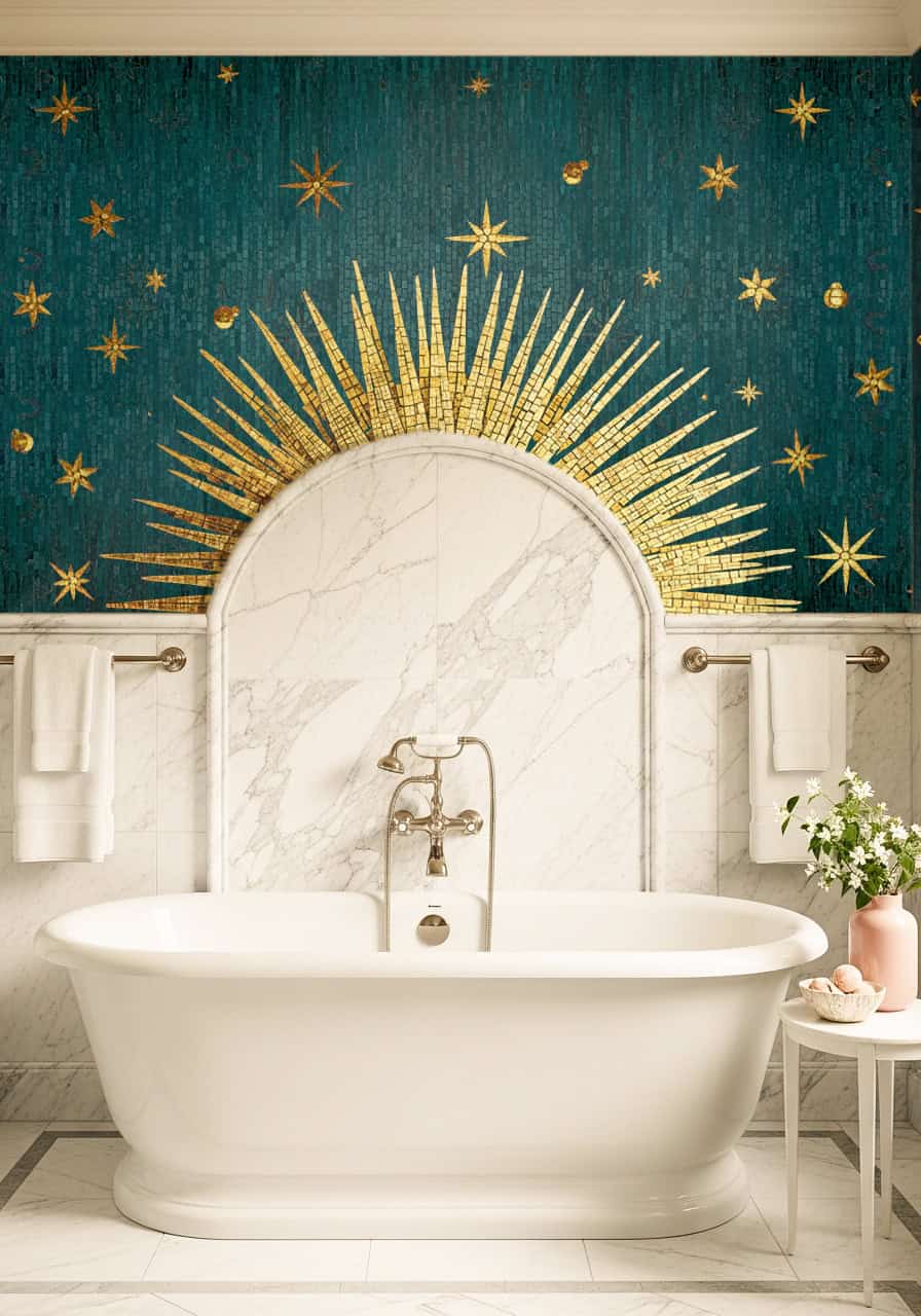 Awaken to the radiance of the heavens with this luminous sunburst mosaic mural. Golden rays extend upward in dazzling brilliance, set against a deep teal sky adorned with scattered stars, evoking both grandeur and serenity. Each tessera is meticulously handcrafted, blending the richness of gold with the calm depth of celestial blue, creating a design that feels timeless and divine. Positioned above the bathtub, the mural becomes the heart of the space, infusing every soak with warmth, light, and the quiet wonder of a rising sun breaking into the cosmos.