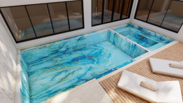 The color scheme blends delicate tones of turquoise, aqua blue, sea green, and hints of golden accents, giving the pool a luminous and ethereal quality. The light-catching surface enhances the reflection of the water, making the pool appear vibrant and refreshing.