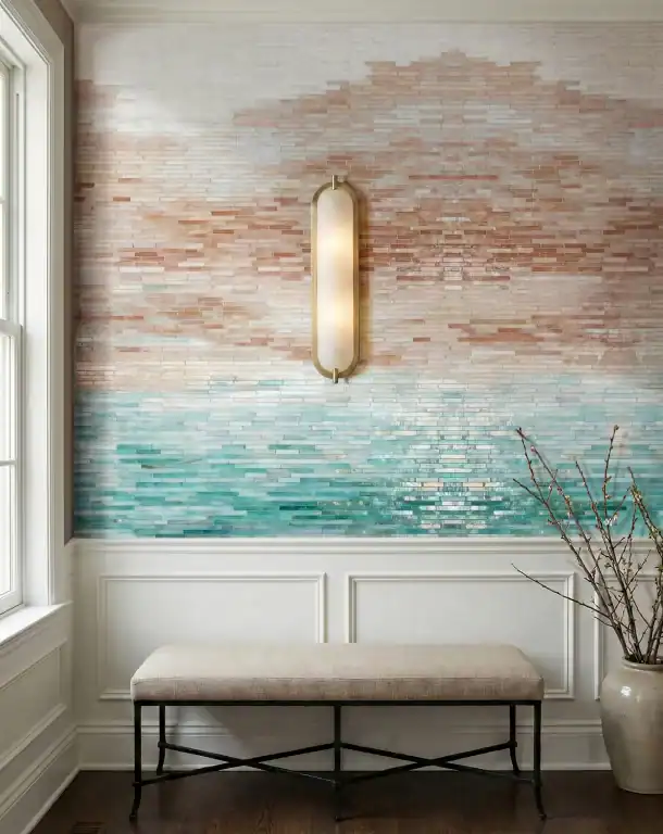 This Terracotta Tide Fade Mosaic wall design creates a soft ombre “horizon” effect using thin, horizontal stick mosaic tiles. The color shifts from warm blush, sand, and light terracotta at the top into a cool aqua/sea-glass band near the bottom. The fade looks natural because the mosaic tiles mix light and medium shades in small steps, not big blocks. The uneven, hand-set look of the slim pieces also adds texture, so the wall feels calm, artistic, and not flat.