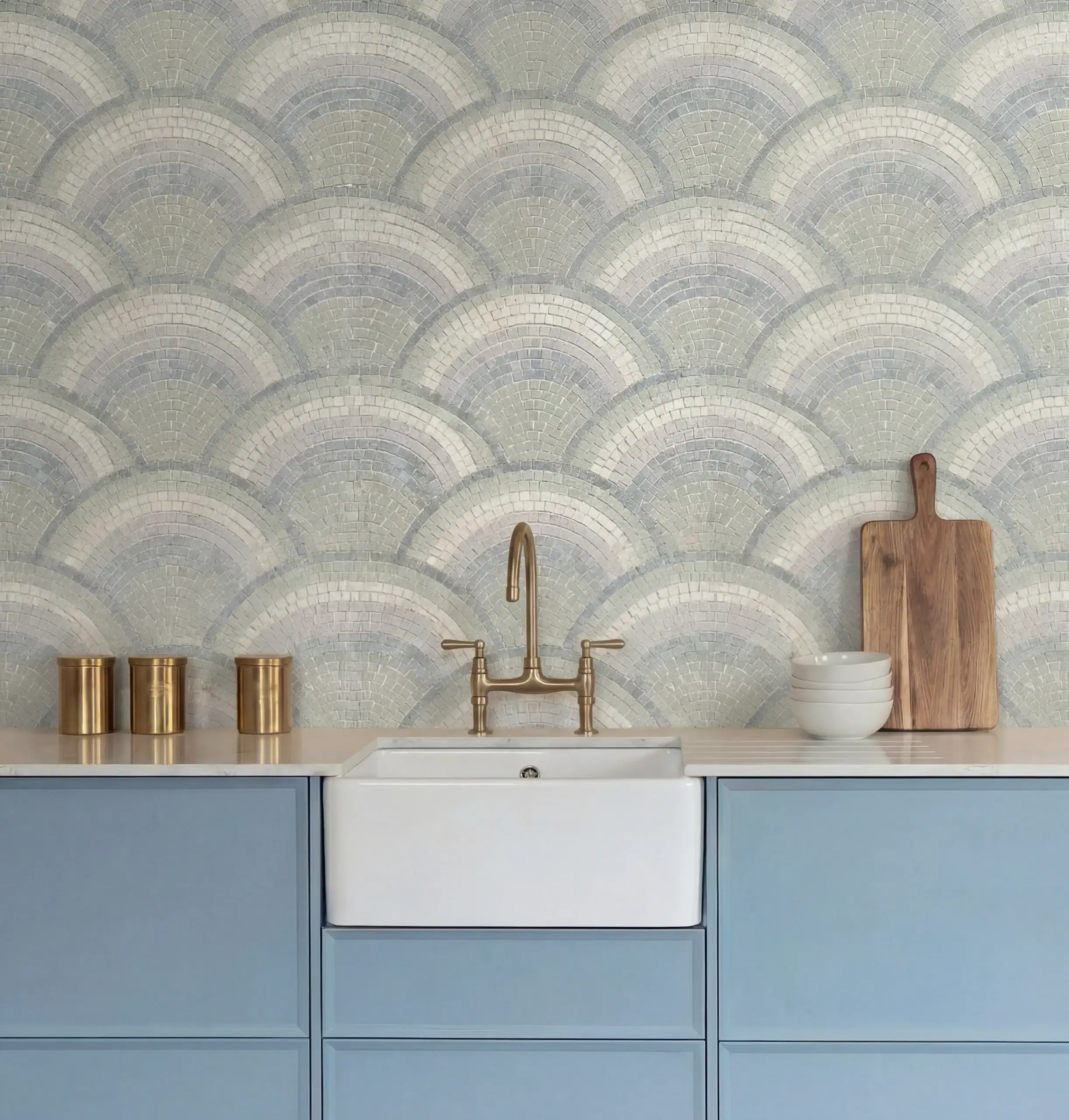 “Azure Tide” is a serene, wave-inspired mosaic that captures the gentle rhythm of the ocean through layered scallop patterns. Its soft geometry and calming tones create a soothing visual flow, making it ideal for tranquil, elegant interiors.