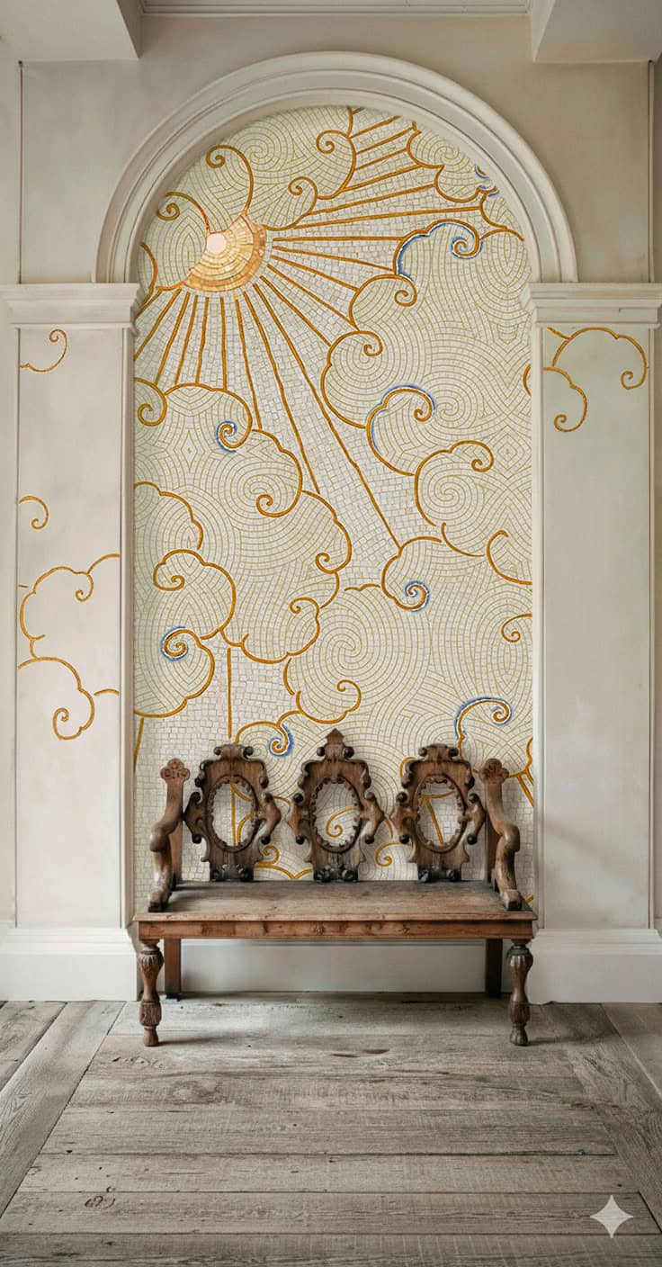 Step into a golden dawn with this radiant mosaic mural that captures the warmth of sunlight breaking through swirling clouds. The hand-laid tesserae in shimmering gold and soft ivory create a sense of movement, as though the rays are gently streaming across the wall and filling the room with light. The graceful curls of the clouds, accented with hints of blue, add an airy elegance that balances grandeur with tranquility. Perfectly framed within the arch, this artwork transforms the space into a serene sanctuary, evoking the uplifting calm of a sunlit morning sky.
