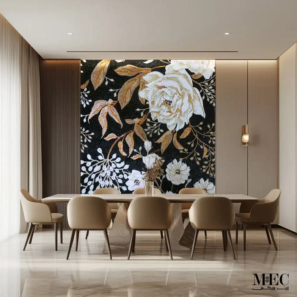 The floral mosaic wall brings elegance, boldness, and texture into interiors. With its white blossoms, golden accents, and dramatic contrast, it becomes a centerpiece that defines the room’s atmosphere.