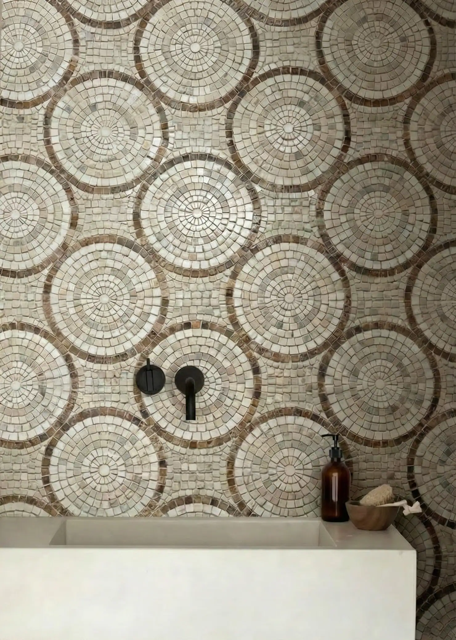 Sandstone Roundel merges traditional mosaic artistry with a contemporary neutral palette, making it suitable for both classic interiors and modern, minimalist spaces.