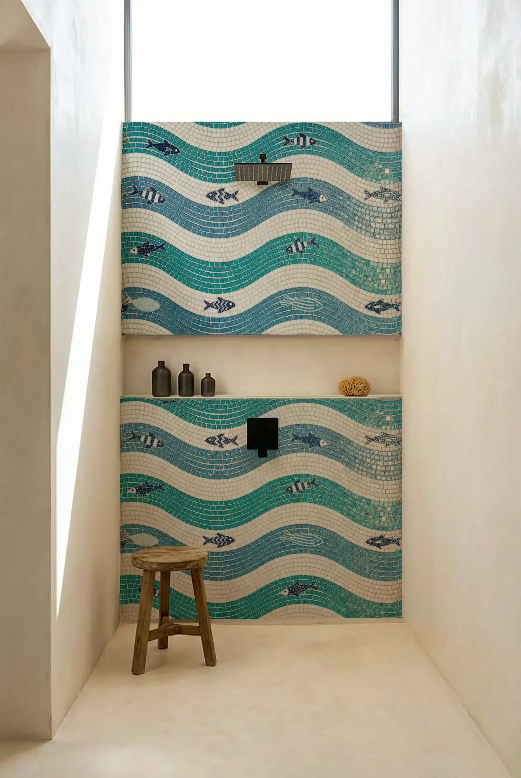 This refreshing Tidal Rhythm bathroom mosaic installation transforms the shower wall into a vibrant coastal retreat. Flowing wave-pattern mosaic bands in layered turquoise, teal, and soft ivory create rhythmic movement, while delicately crafted fish mosaics swim effortlessly across the surface. The small-format mosaic tesserae form a richly textured, alluring composition that blends artistry with modern architectural minimalism, turning the shower space into a serene underwater masterpiece.