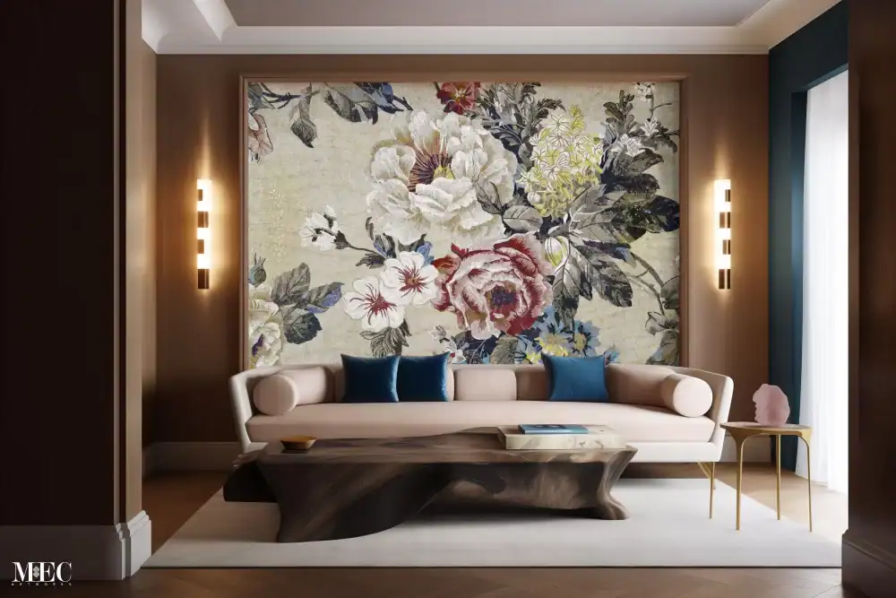 Ideal for living rooms, dining areas, or statement lounge walls, this floral mural transforms interiors into a gallery-like setting, bringing both warmth and grandeur.