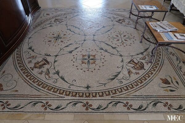 The mosaic is designed around a grand circular medallion, delicately framed with multiple borders. Its shape is ideal for centering within octagonal rooms, domes, or large open-plan spaces where radial symmetry enhances spatial flow.