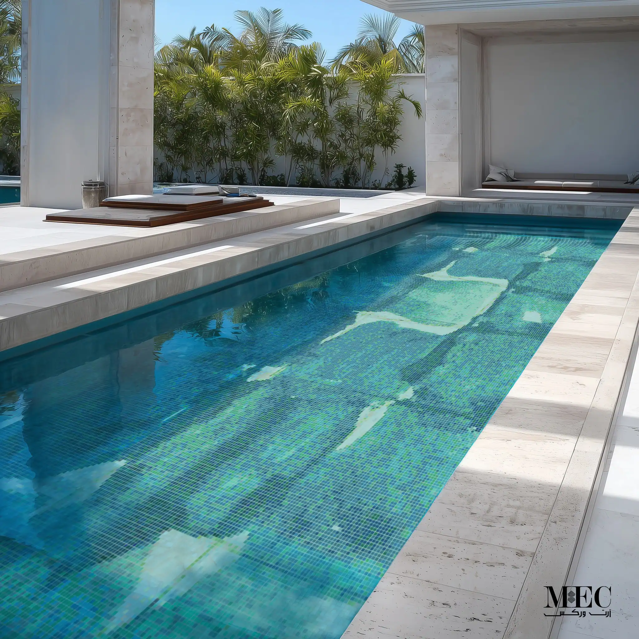 This pool brings together calm beauty and modern design. The mosaic tiles reflect fresh shades of green and blue, giving the water a lively, natural glow. The surface shines under the sunlight, creating a soothing atmosphere that feels both elegant and refreshing.