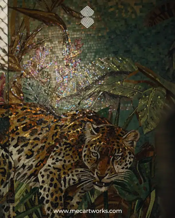The Verdant Jungle Leopard Mosaic brings a warm, tropical jungle to life. A graceful leopard moves through layered foliage and golden light. It creates a rich, immersive statement for luxury interiors.