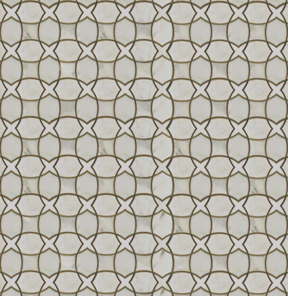 The Verona Cross Marble Mosaic features a graceful pattern of intersecting circles and geometric crosses outlined in rich bronze tones. The soft white marble base enhances the contrast, creating a luxurious yet balanced visual rhythm. With its classic symmetry and metallic detailing, this mosaic exudes timeless elegance and modern sophistication — ideal for accent walls, statement floors, or decorative backsplashes that seek to blend artistry with refined luxury.
