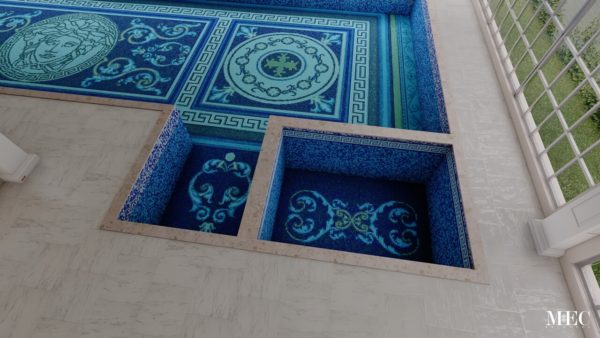 Elaborate ancient Greek art inspired glass mosaic design for an indoor swimming pool. The pool tile design features a Versace medusa medallion motif in the center. The three-section pool art features Greek meander border and classic scrolling vines around the decorative tile medallions. The walls of the pool are clad with a blue Vertex tile blend (random mixing). The hot tub Jacuzzi corner floor has scrolling leaves and vine motif that compliments the main pool design.