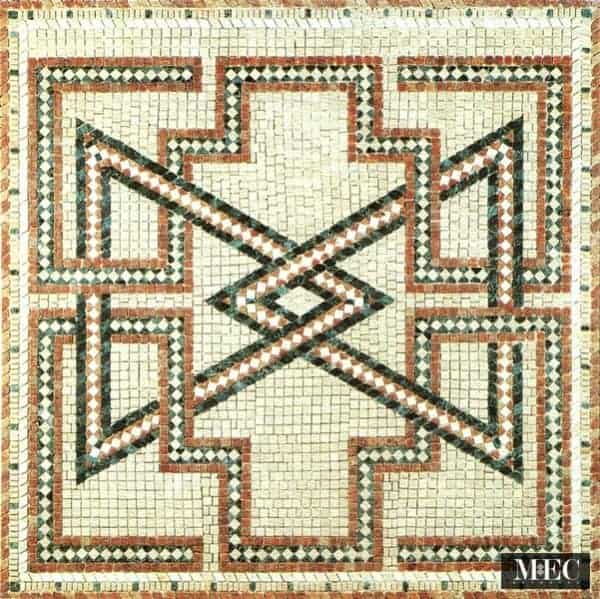 The Vienna Roman Floor Mosaic depicted in the image is a remarkable piece of craftsmanship that reflects classical Roman aesthetics through intricate geometry, well-balanced color schemes, and highly durable construction.