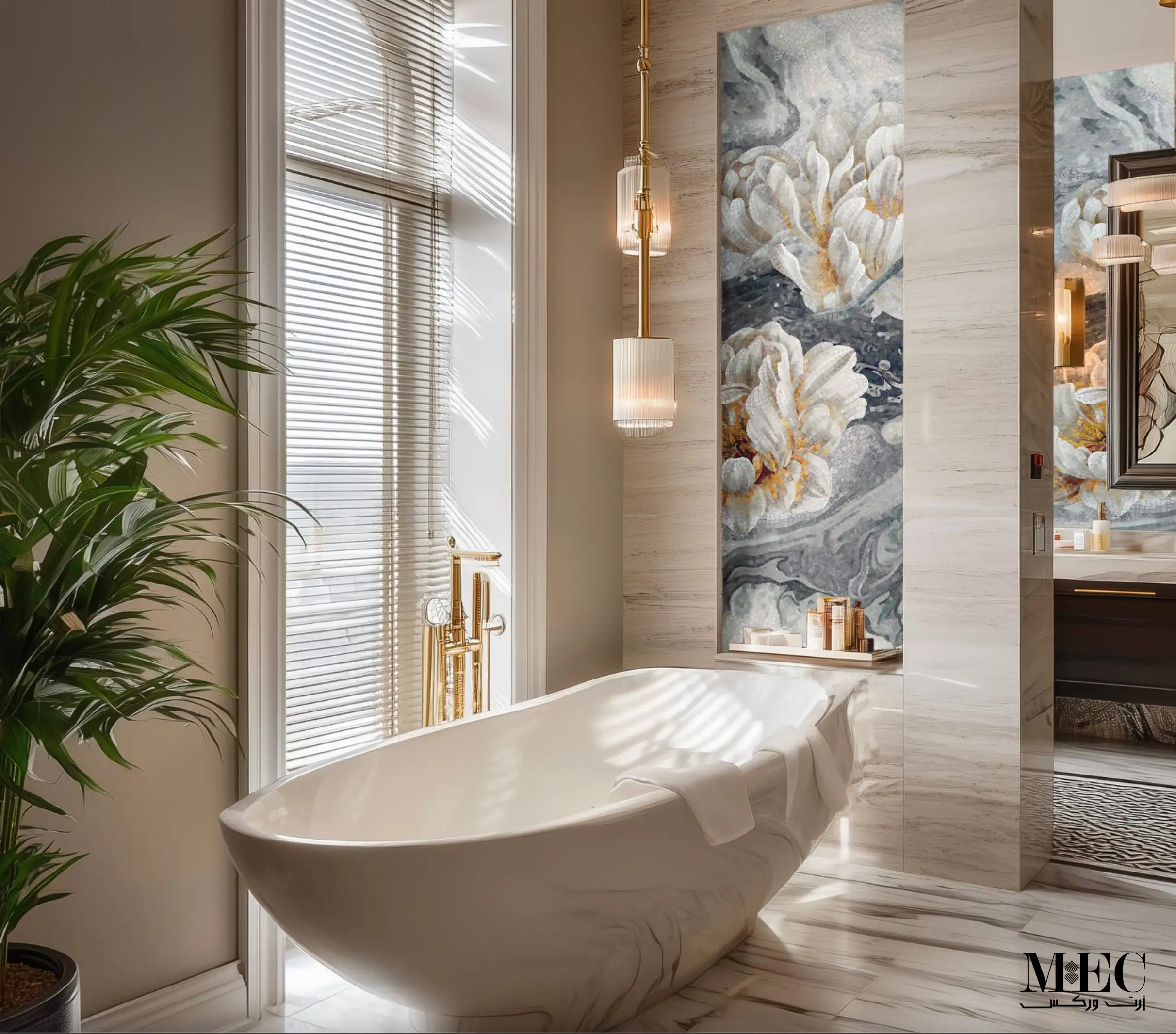 The color palette showcases a serene blend of creamy whites, subtle grays, and soft blues. The flowers feature delicate white and cream tones, while the background swirls with calming blues and grays. This harmonious and elegant combination contributes to a refined and tranquil atmosphere, making the space feel like a luxurious spa. The mosaic’s use of a cool palette with warm floral accents perfectly complements the room’s elegant brass fixtures and natural light.